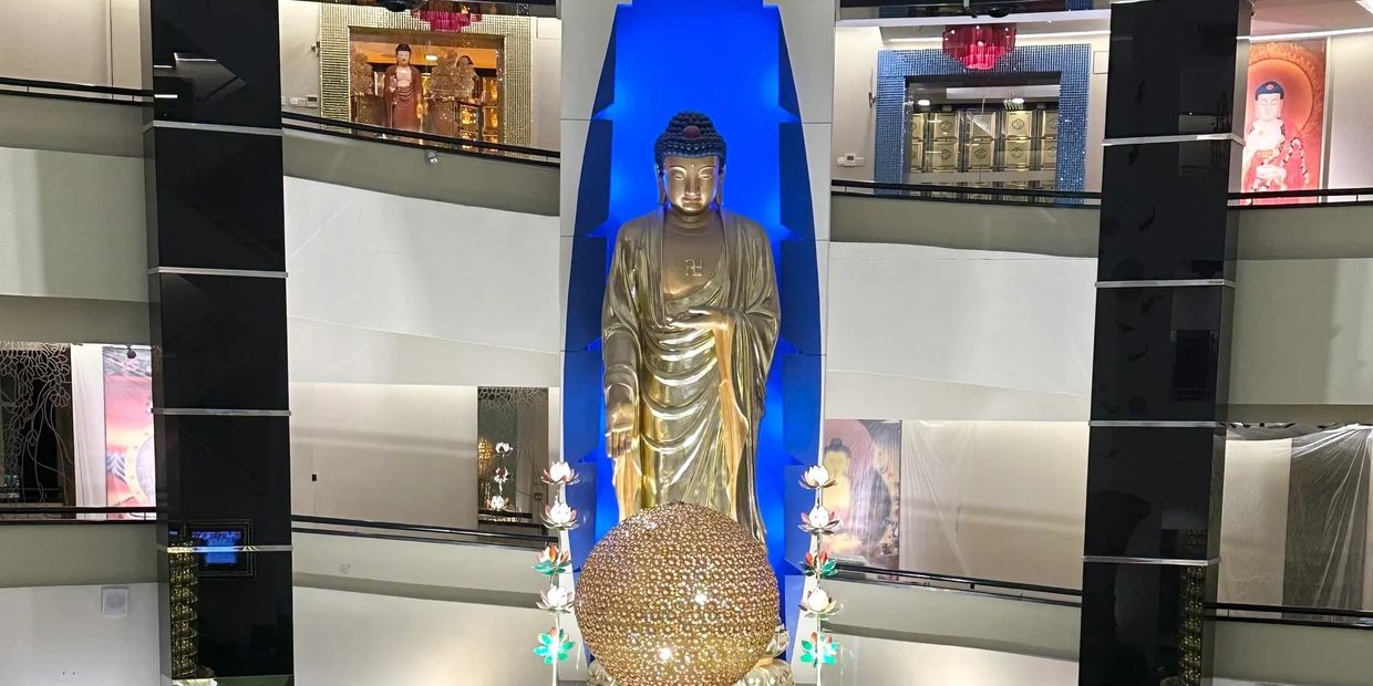 此灵骨塔混合着金色的表面和优雅雕塑, 散发出宁静的魅力。