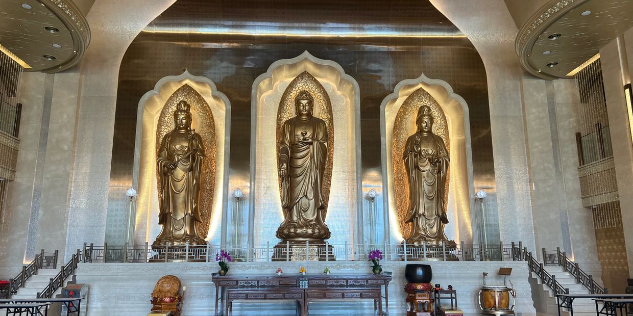 The Main Hall (also called Hall of Three Buddha) is a traditional Buddhist Columbarium in Singapore. The three magnificent golden buddha statues include Amitabha Buddha , Avalokitesvara Bodhisattva and Mahasthamaprapta Bodhisattva. They are in charge of the Western Pure Land of Ultimate Bliss (Sukhavati).